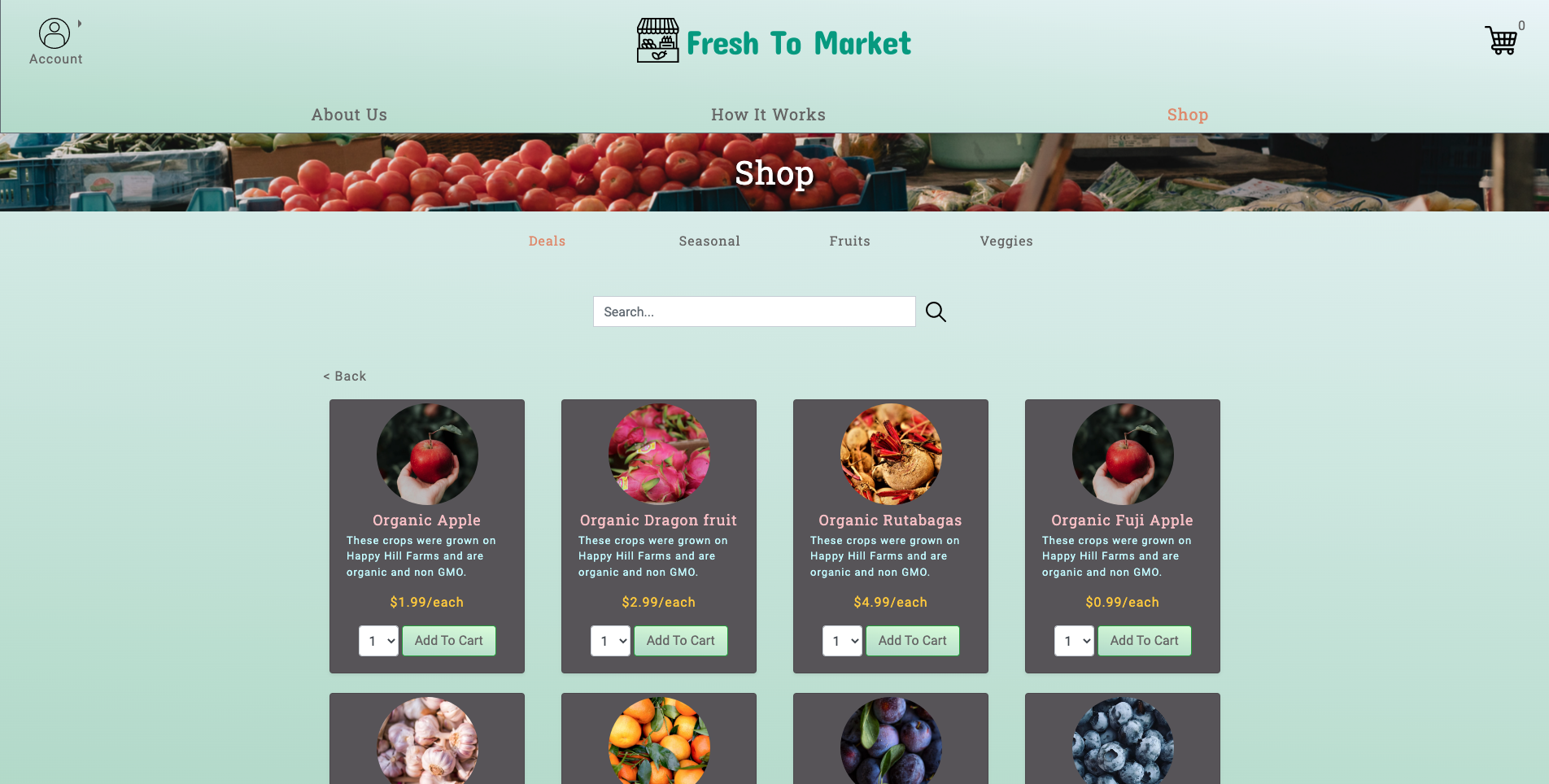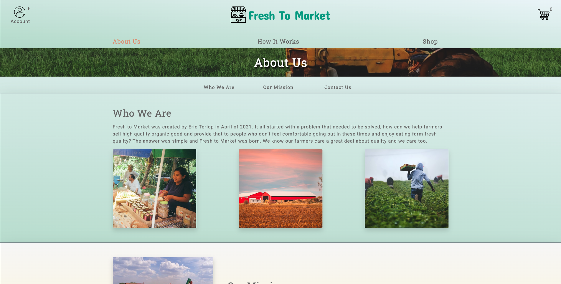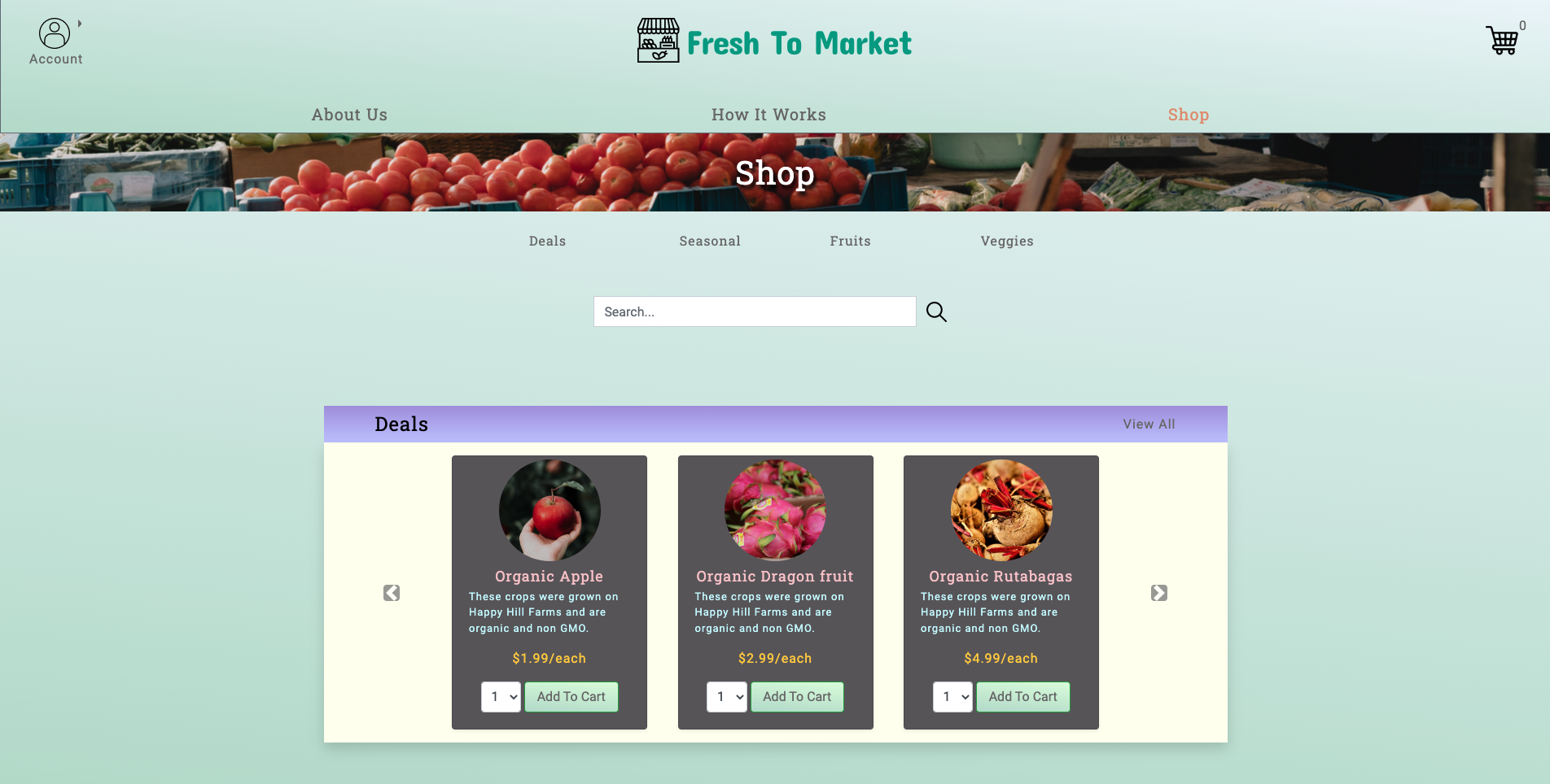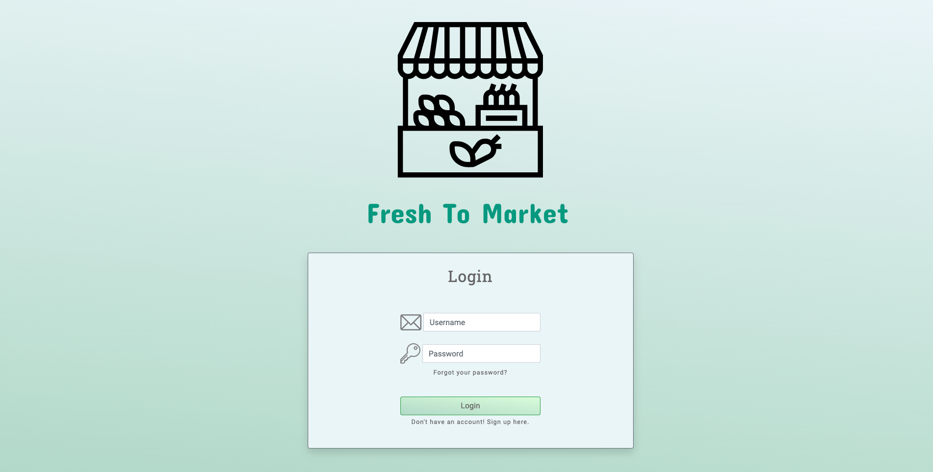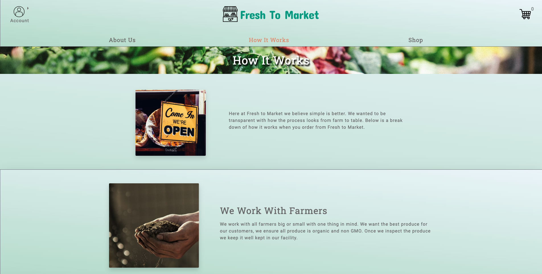 Fresh to Market is a project inspired by the concept of selling fresh produce to people in need. The primary function of this project is to utilize bootstrap to make a responsive website that can function and look good on all different screen sizes. The project features an option to search for select items, a way for a user to log in, sign up, and even an option to add items to your cart and clear your cart.