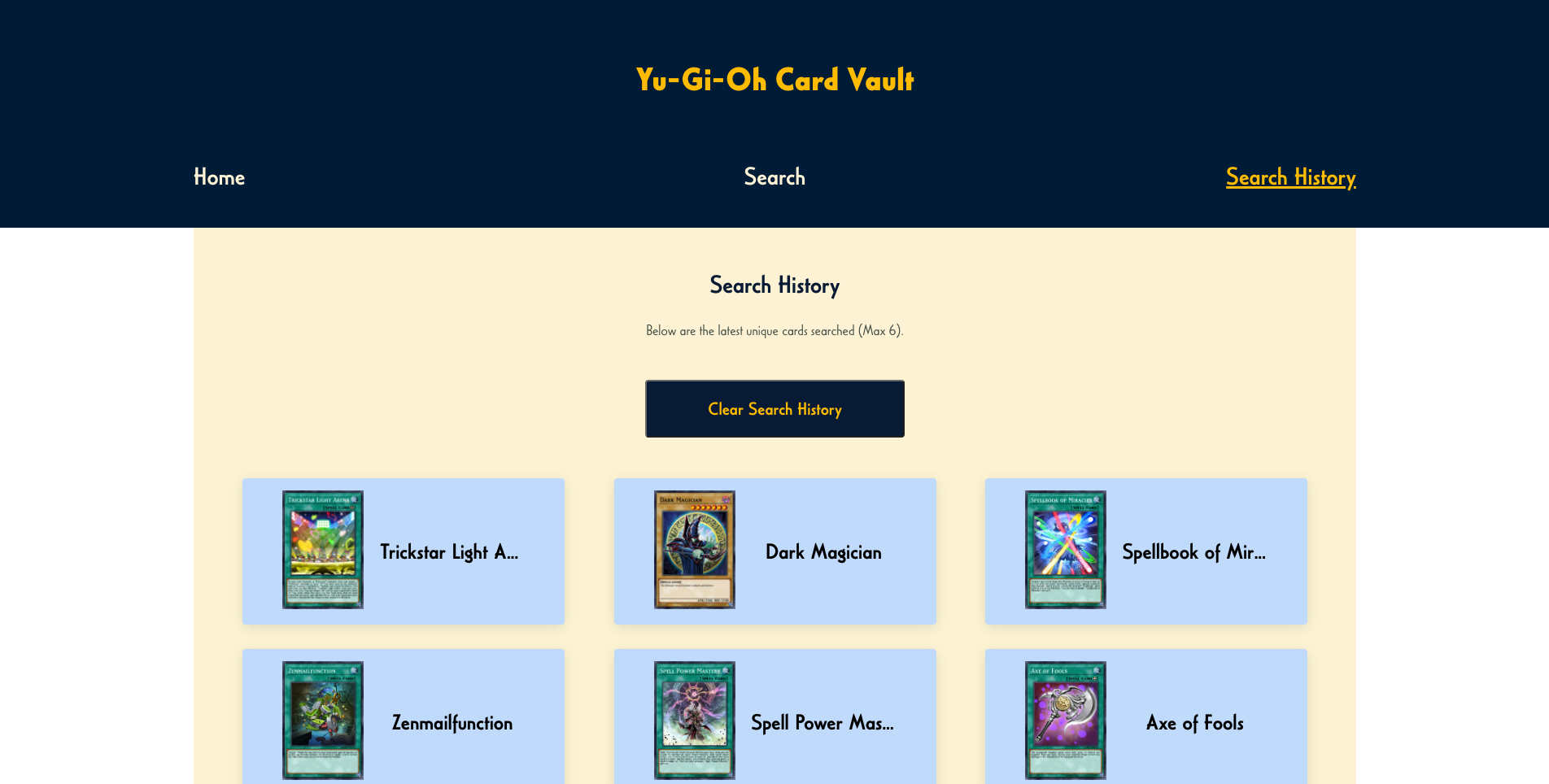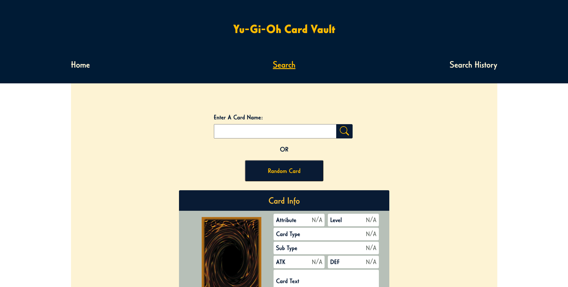 The solution is a simple one, Yu-Gi-Oh! Card Vault will focus on the exploring random cards or you can search a card by typing it in to the search bar. Yu-Gi-Oh! Card Vault will focus on better organization of information, make a clean and easy-to-use layout for users, and allow users to view their search history. Yu-Gi-Oh! Card Vault will be focusing on a single aspect that has been lacking in many other websites which is strictly the exploration and information of Yu-Gi-Oh! cards.