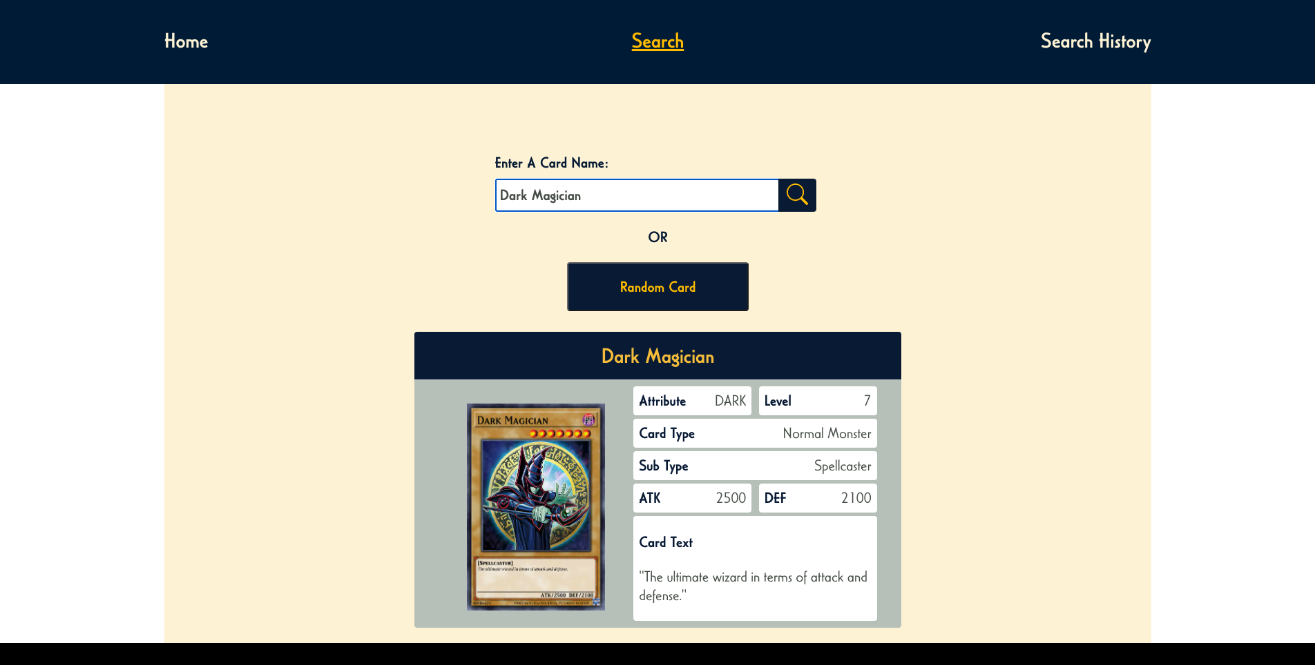 Loving games, I felt it was only natural that I would choose to base my project on the Yu-Gi-Oh! Card game. Although surprising enough, it wasn’t my first choice when developing my project. I wanted to use a Pokemon API, but I found the available ones were a bit too unpredictable when the information returned. So with that in mind, I decided to utilize the Yu-Gi-Oh! API by YGOPRODeck.